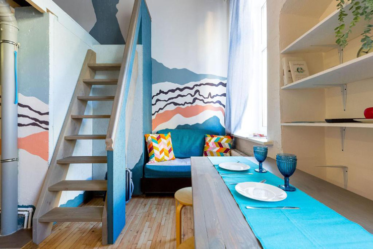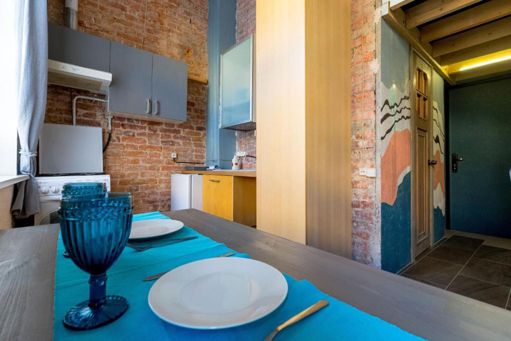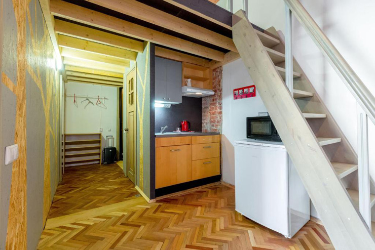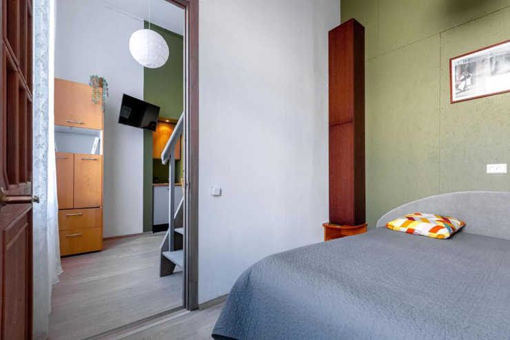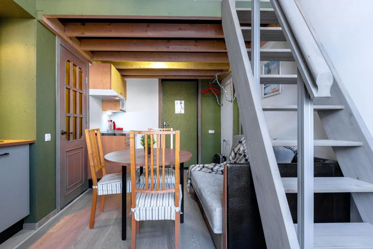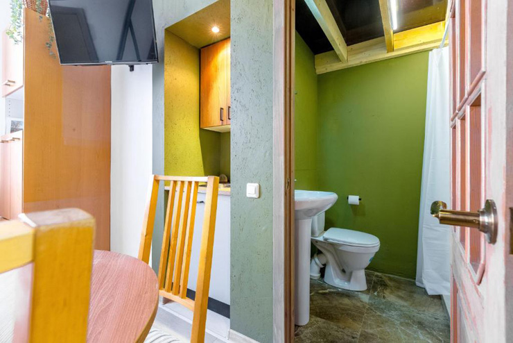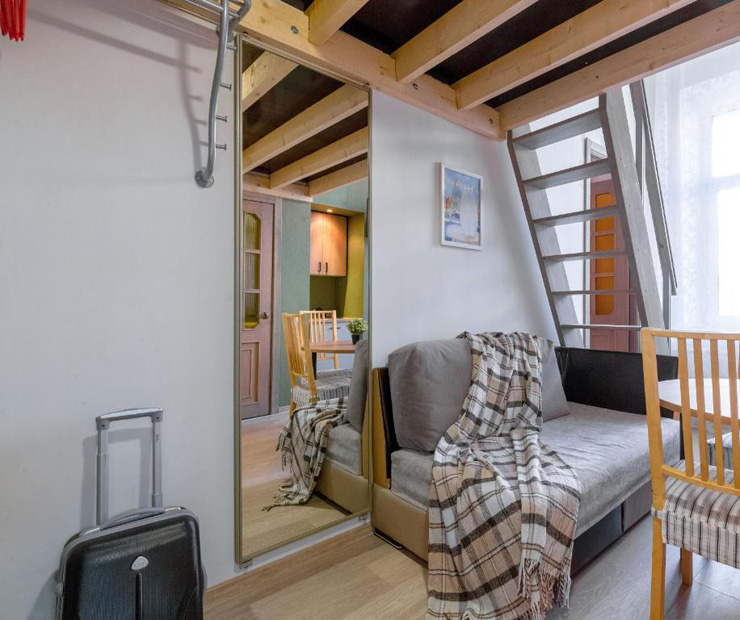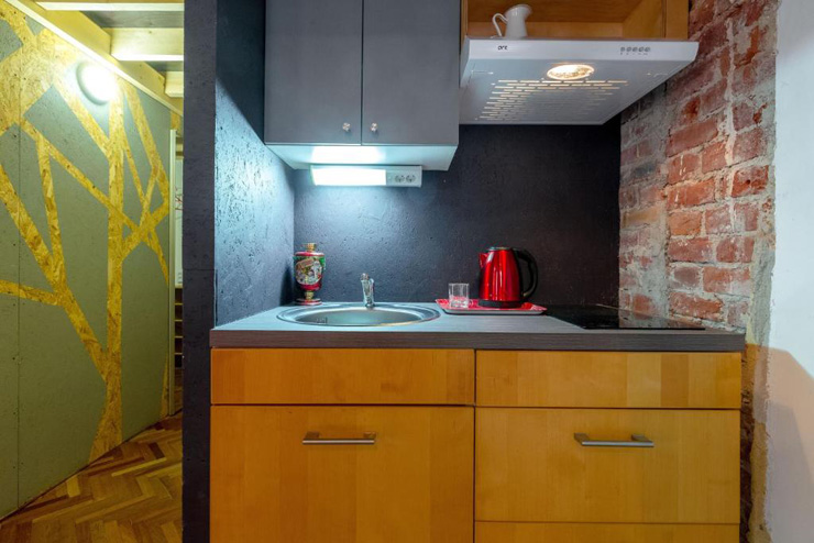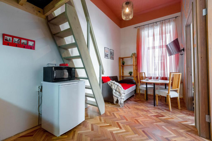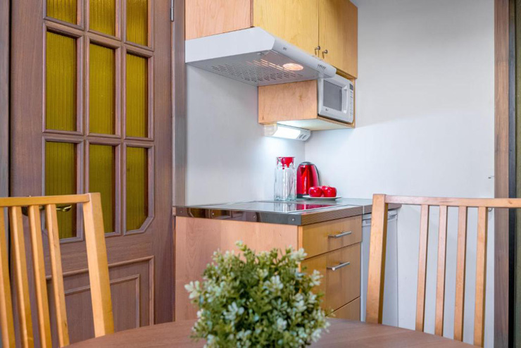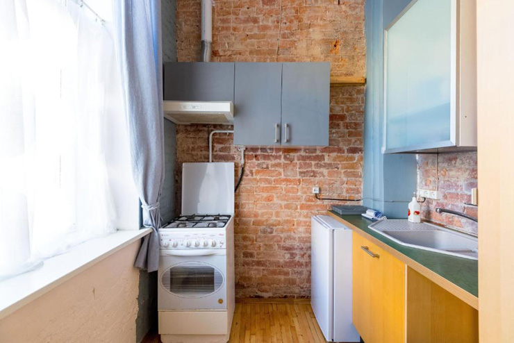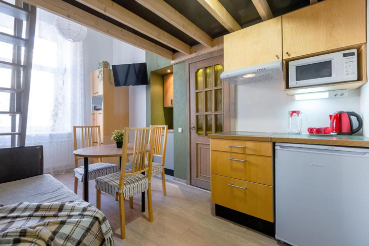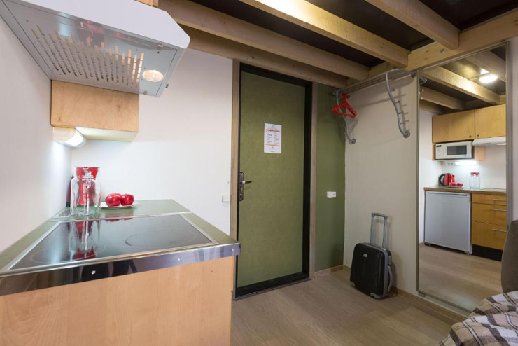- Оборудование: гладильная доска, микроволновая печь, мини-холодильник, набор посуды, плита электрическая, телевизор, утюг, электрочайник